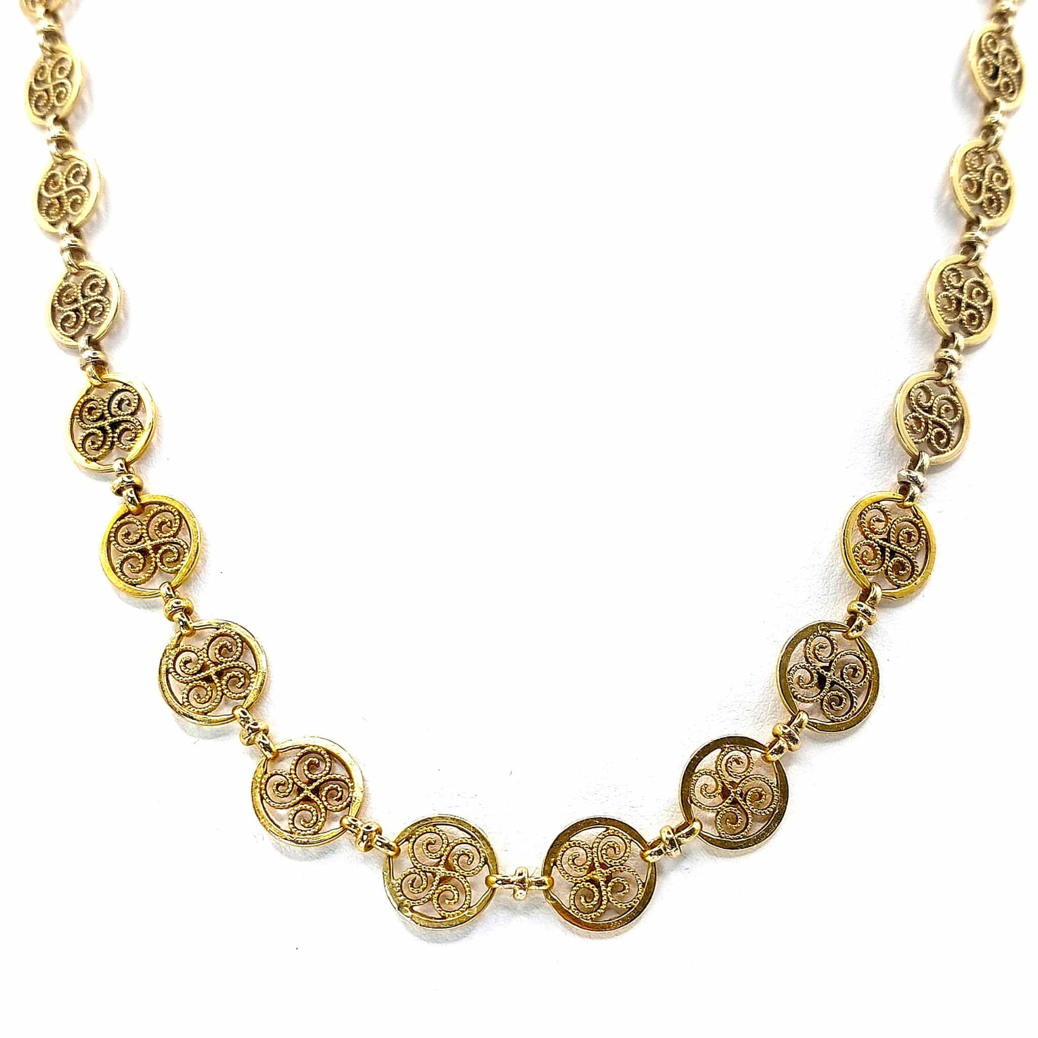 Pour chaque maillon de ce collier en filigrane d’or, l’orfèvre a dû façonner avec une précision chirurgicale les quatre enroulements intérieurs avant de les fixer au sein du cercle d’or. Le point d’or central n’est pas seulement esthétique : il vient habilement dissimuler le point de soudure, témoignant d’une maîtrise technique exceptionnelle où la structure devient ornement.