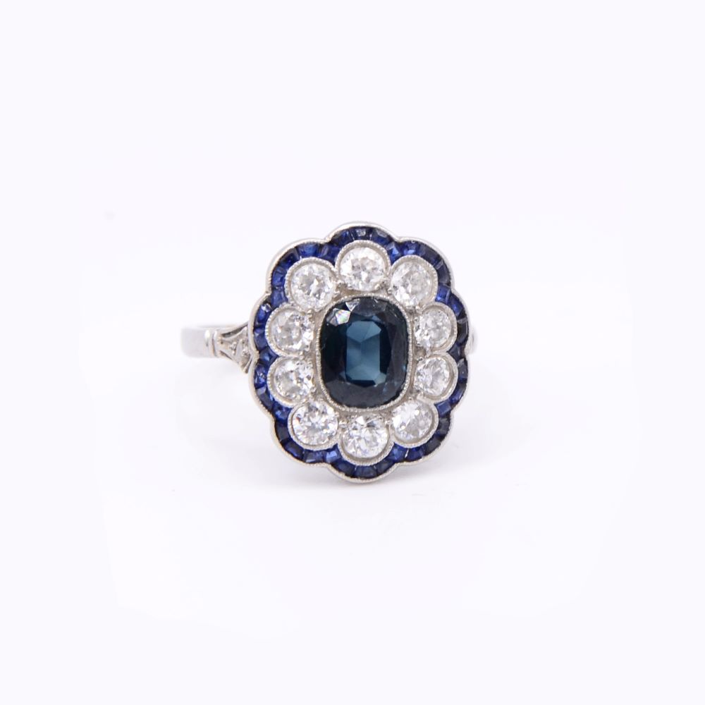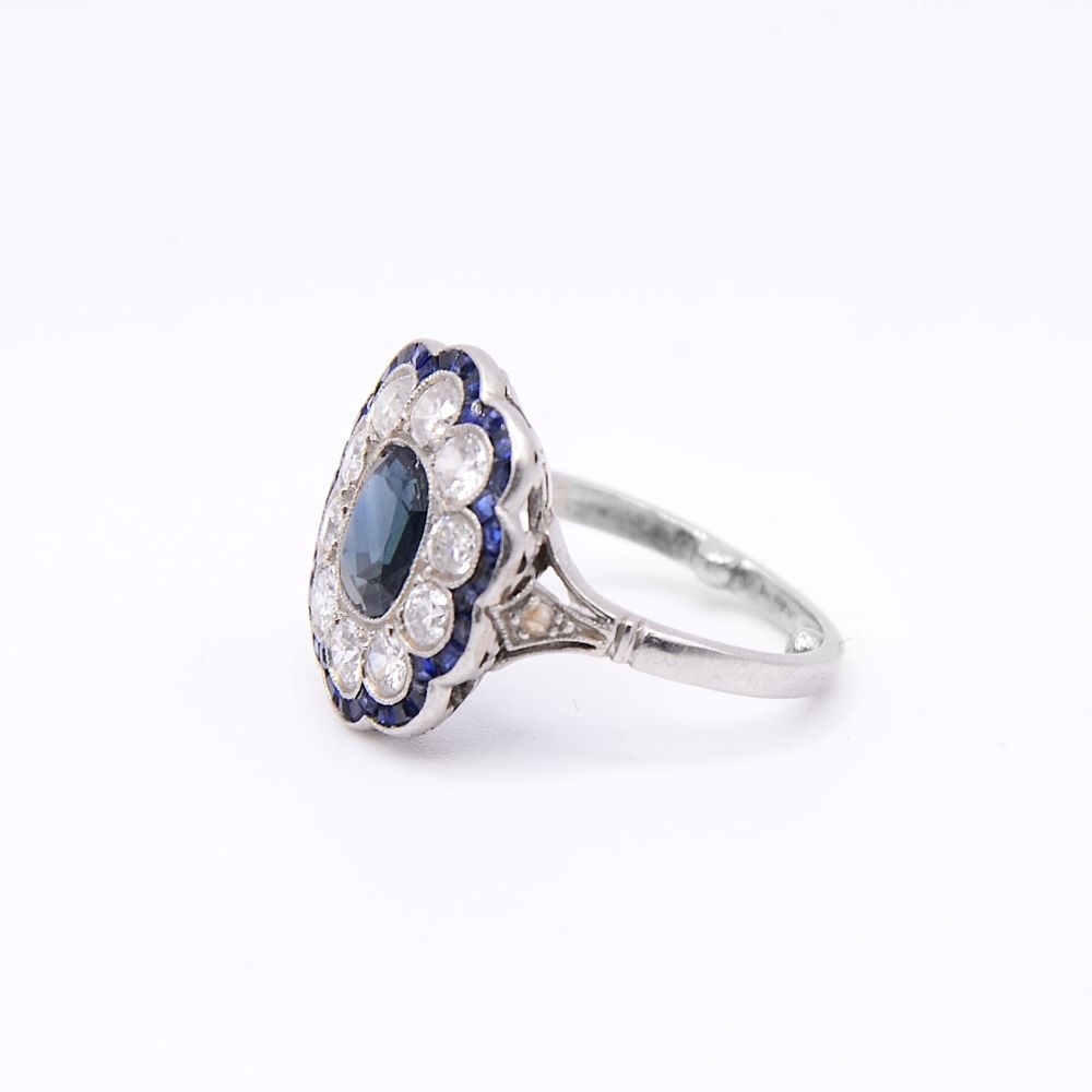 Elégante bague marguerite saphir ancienne en platine 950, centrée d’un saphir naturel de taille coussin rectangulaire, pesant environ 1,30 ct, serti clos millegrain. Le saphir est serti dans un entourage festonné de diamants ronds taille ancienne, puis de saphirs calibrés. La corbeille est finement travaillée avec une frise délicate, tandis que les épaulements en palmette accueillent un petit diamant taillé en rose.