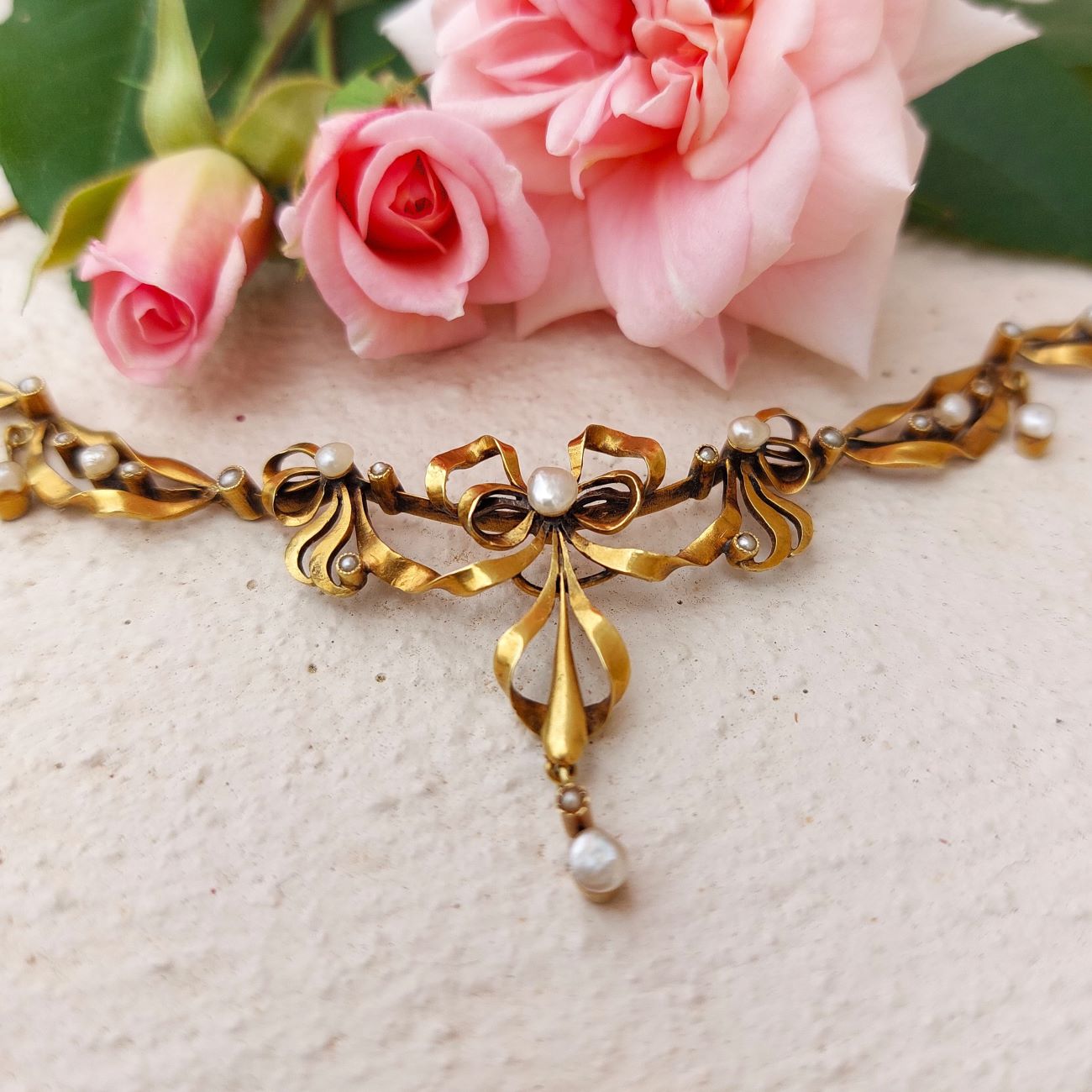 The Belle Époque reclaimed it with a new lightness. The bows shed their Rococo monumentality, becoming more supple and airy, worked in fine gold ribbon folded and crossed with an almost textile precision. The addition of seed pearls — small natural freshwater or marine pearls, irregular and soft — is characteristic of the period: they punctuate without weighing down, lending a milky whiteness that answers the warmth of yellow gold.