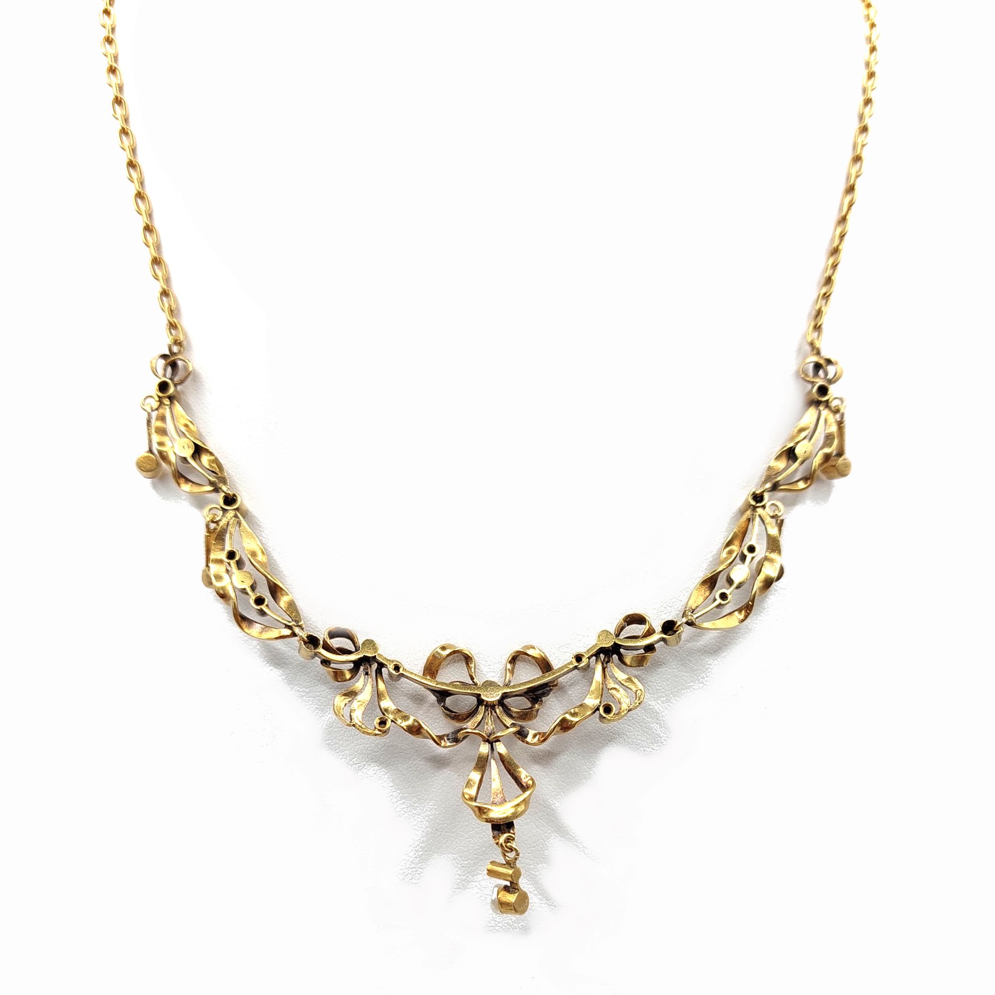 Ce collier Belle Époque nœuds est en bon état général pour une pièce de cette ancienneté et de cette délicatesse de construction. Les nœuds sont intacts, les retournements de rubans d’or nets et bien formés — signe d’un travail d’orfèvrerie soigné, qui a résisté au temps sans déformation. Les articulations fonctionnent librement.